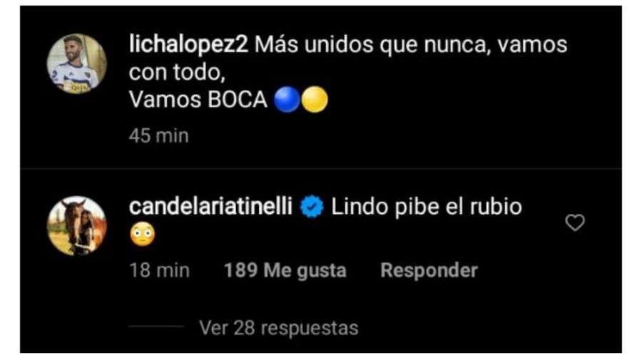 "Lindo pibe el rubio", escribió Cande debajo de las imágenes, en alusión al atacante del Santos de Brasil, junto al emoji de una cara sorprendida. Acto seguido, estallaron las reacciones de los seguidores del futbolista argentino.