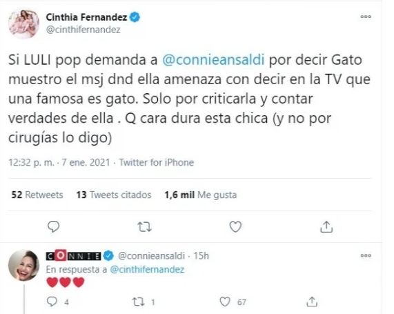 "Si Luli pop demanda a @connieansaldi por decir ‘gato’ muestro el mensaje donde ella amenaza con decir en la TV que una famosa es gato. Solo por criticarla y contar verdades de ella. ¡Qué cara dura esta chica! (y no por cirugías, lo digo)", escribió la bailarina en Twitter. Al ver la mención de su actual compañera de LAM, Connie le respondió con corazones.