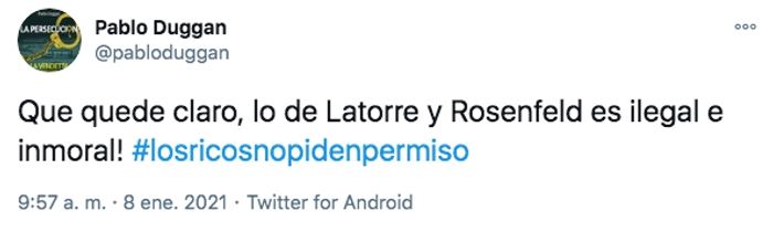 En medio de la celebración de Latorre, el periodista Pablo Duggan saltó con los tapones de punta con un fuerte tuit: "Rosenfeld y Yanina Latorre, excelentes representantes de la inmoralidad de cierta parte de la clase acomodada Argentina. Ir a vacunarse a Miami es lamentable por varios motivos".