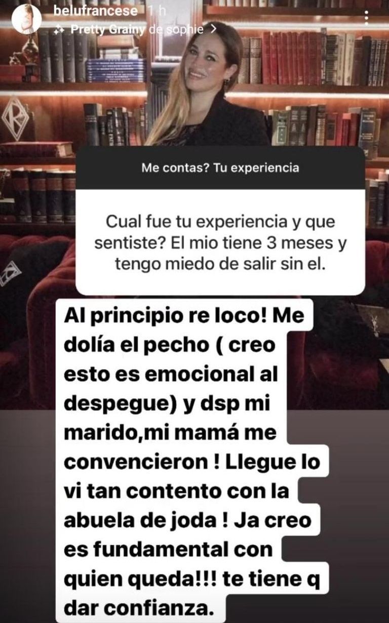 "Al principio fue re loco. Me dolía el pecho (creo que esto es emocional por el despegue) y después mi marido y mi mamá me convencieron. Llegué y lo vi tan contento... Con la abuela de joda. Creo que es fundamental con quién queda. Te tiene que dar confianza", manifestó.