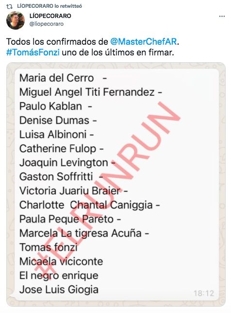 Fue Lío Pecoraro quien publicó el listado a través de su cuenta de Twitter. "Todos los confirmados de @MasterChefAR", escribió el periodista, quien agregó que la última figura en firmar el contrato fue el actor Tomás Fonzi.