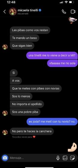 "Sí. A vos que te metes con pibes con novias. Sos lo menos, no importa el apellido, sos una pobre piba", escribió la empresaria. "¿Es joda? ¿Me metí con tu novio? No", le contestó. "No, pero te hacés la canchera", concluyó Mica.