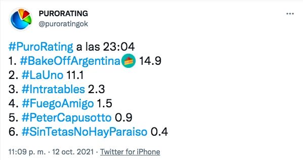 Durante la jornada de este martes, Doctor milagro (Telefe) volvió a ser el programa más visto del día con un promedio de 16 puntos y un pico de 17.8 puntos de rating, en un episodio extendido que finalizó a las 23 hs. A continuación, Bake Off (Telefe) promedió 13.8 puntos y alcanzó un máximo de 15 puntos, transformándose en el segundo título más visto del día.