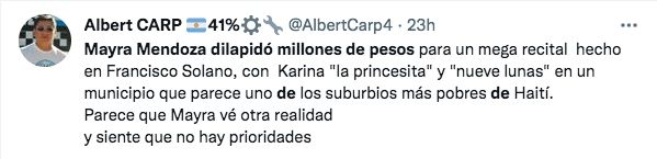 Una gran cantidad de mensajes inundaron Twitter con críticas contra la intendenta Mayra Mendoza y contra la artista, cuestionando los supuestos 8 millones de pesos que se gastaron. "Mayra Mendoza dilapidó millones de pesos para un mega recital hecho en Francisco Solano con Karina La Princesita, en un municipio que parece uno de los suburbios más pobres de Haití", fue tan solo uno de los tantos mensajes que colmaron la red social del pajarito.