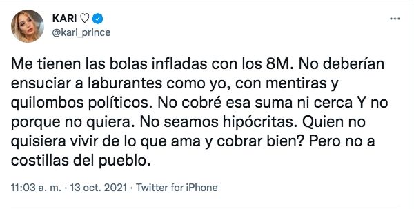 Enterada de las repercusiones, Karina decidió salir a responder con un contundente descargo. "Me tienen las bolas infladas con los 8M. No deberían ensuciar a laburantes como yo, con mentiras y quilombos políticos", sentenció. Y continuó: "No cobré esa suma ni cerca y no porque no quiera, no seamos hipócritas. ¿Quién no quisiera vivir de lo que ama y cobrar bien? Pero no a costillas del pueblo".