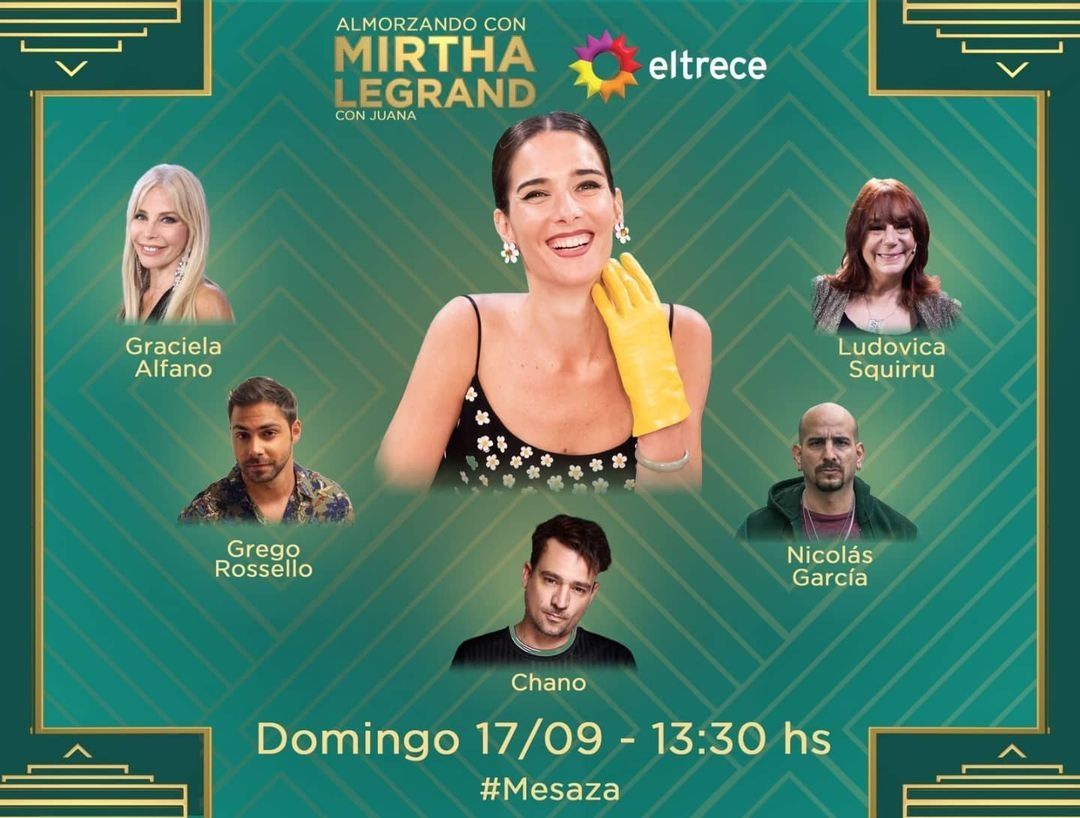 Por su parte, el domingo 17 de octubre, en Almorzando con Mirtha Legrand, la conductora contará con la presencia del músico Chano Charpentier, la actriz y ex vedette Graciela Alfano, al actor paraguayo Nicolás García Hume, la astróloga Ludovica Squirru y al influencer Grego Rossello.