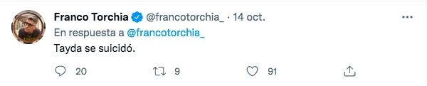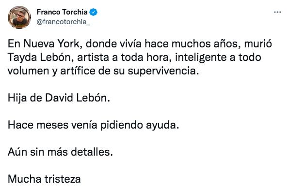 "En Nueva York, donde vivía hace muchos años, murió Tayda Lebón, artista a toda hora, inteligente a todo volumen y artífice de su supervivencia. Hija de David Lebón. Hace meses venía pidiendo ayuda. Aún sin más detalles. Mucha tristeza",escribió el periodista. Luego, se encargó de despejar dudas sobre los detalles de la muerte de Tayda y confirmó que se trató de un suicidio.
