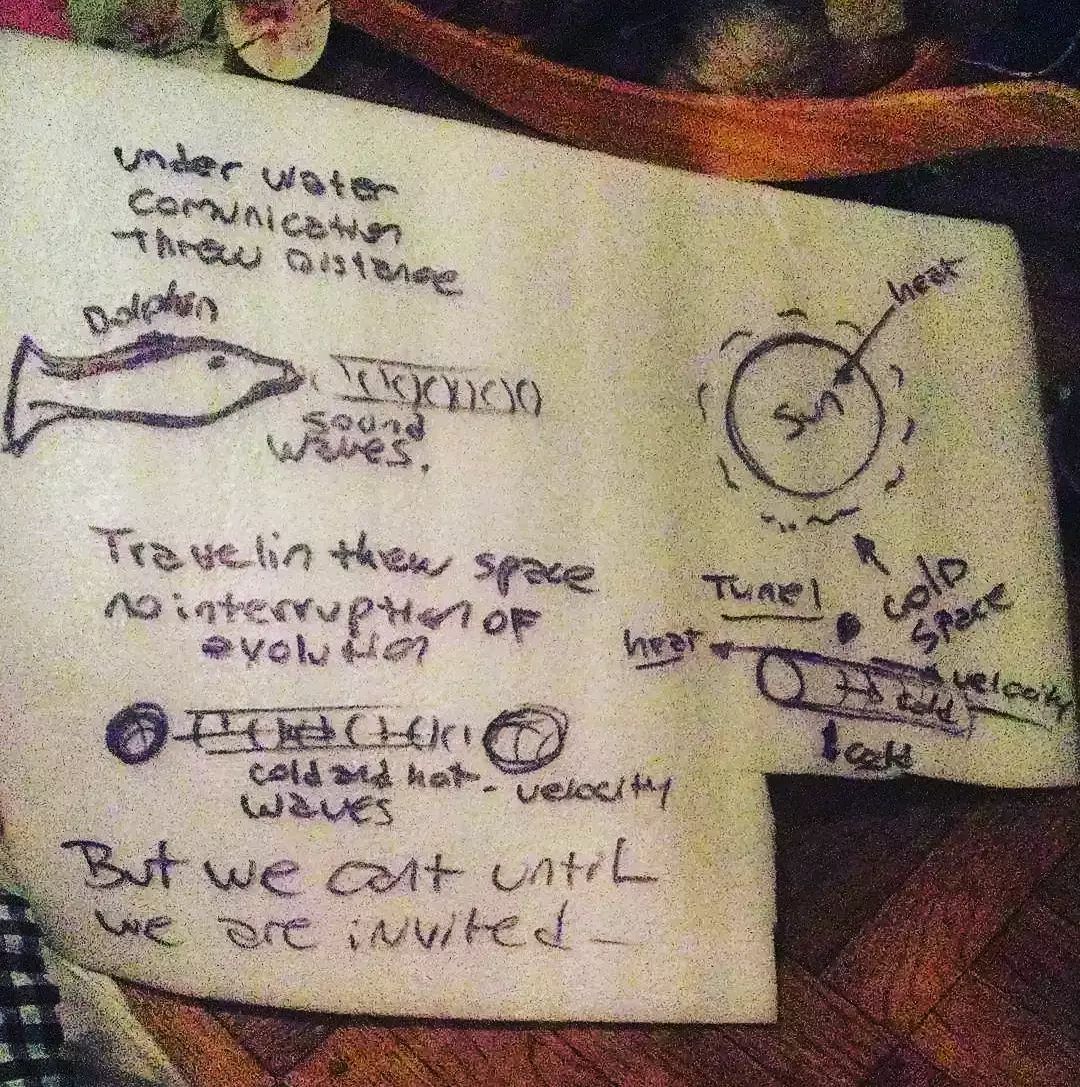 En su última foto se ven dibujos de planetas, su alineación y un túnel en el espacio. Además hay dibujos de animales marinos. "Cómo viajar en el espacio sin interrupción de evolución, sólo cuando los planetas se alinean.... Y como hacer un túnel en el espacio", había escrito en el posteo que acompaña la imagen.