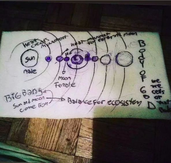 "Somos células del cuerpo de Dios y el cuerpo es los planetas con nosotros más cada especie de cada planeta... Invisible cuerpo como el espacio que es agua invisible prácticamente", se puede leer en otra publicación donde vuelve a hacer referencia al sistema solar.