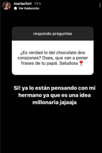 Luego de ser consultada sobre los rumores que indicaban que saldría una edición especial de los chocolates Dos Corazones en honor al mediático empresario, Martita no solo confirmó la noticia, sino que además sumó detalles. "Sí, ya lo están pensando con mi hermano. Es una idea millonaria ja, ja, ja", comentó.