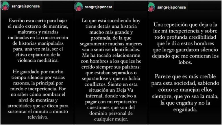 Luego siguió: "Lo que está sucediendo hoy tiene detrás una historia mucho más grande y profunda, de la que seguramente muchas mujeres van a sentirse identificadas. Me ha tocado relacionarme con hombres a los que les he creído siempre sus palabras: que estaban separados o separándose y que no había conflictos. Siento en esta situación un Deja Vu infernal, donde vuelvo a pagar con mi reputación cuestiones que son del dominio personal de cualquier mujer".