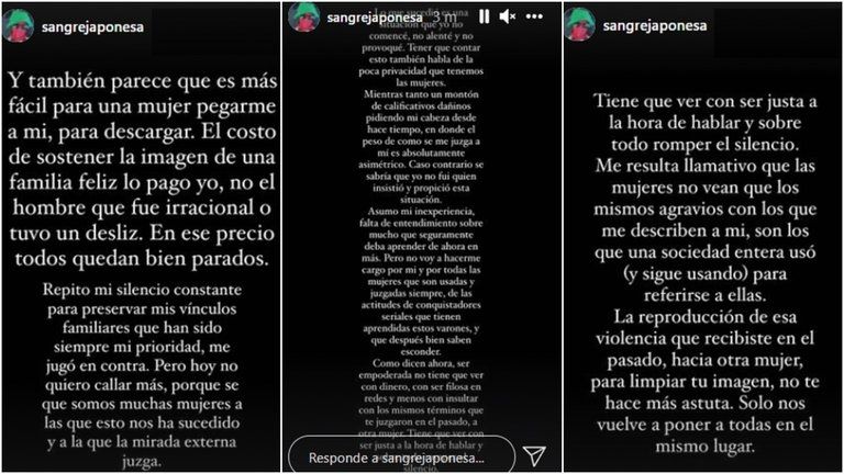 La actriz también se refirió a la falta de sororidad con un fuerte planteo: "Y también parece que es más fácil para una mujer pegarme a mí, para descargar. El costo de sostener la imagen de una familia feliz lo pago yo, no el hombre que fue irracional o tuvo un desliz. En ese precio todos quedan bien parados. Repito mi silencio constante para preservar mis vínculos familiares que han sido siempre mi prioridad, me jugó en contra. Pero hoy no quiero callar más, porque somos muchas mujeres a las que esto nos ha sucedido y a la que la mirada externa juzga".