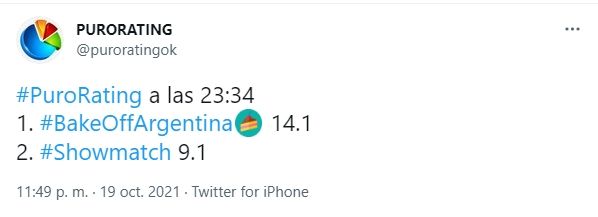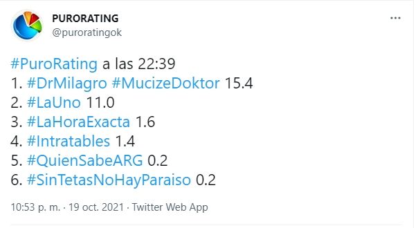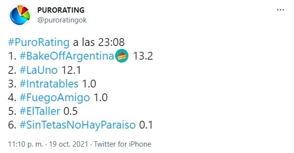Por su parte, la tira nacional de Polka tuvo que conformarse con un tercer puesto entre los más vistos del día con un promedio de 11.6 y picos de 12.1, estando muy cerca de alcanzar a Bake Off (Telefe) que con un promedio de rating final de 13.2 puntos y picos de 14.1 logró quedarse con el segundo lugar. Una performance no menor para el reality de pastelería que estuvo a 1 punto de empatarle a la novela turca, la cual viene consolidándose como el programa de mayor audiencia en los últimos meses.
