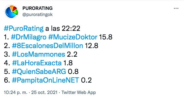 Más temprano, El Trece remontó notablemente los números de audiencia con Guido Kaczka, quien alcanzó un pico de 12.8 puntos con Los 8 escalones del millón, que se mantuvo segundo en la franja correspondiente a su horario.