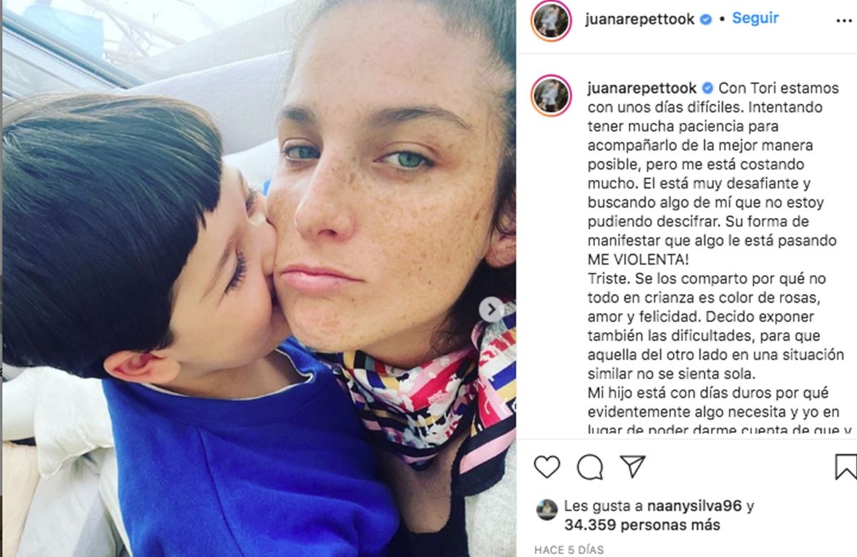 Con un posteo muy honesto, Repetto se lanzó a narrar lo que la atraviesa en este presente y sobre todo reflexionar respecto a las aristas de la maternidad que presentan desafíos y retos para superar. “Con Tori estamos con unos días difíciles. Intentando tener mucha paciencia para acompañarlo de la mejor manera posible, pero me está costando mucho”, arrancó en su publicación.