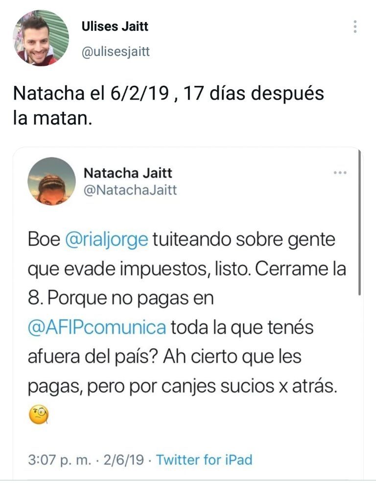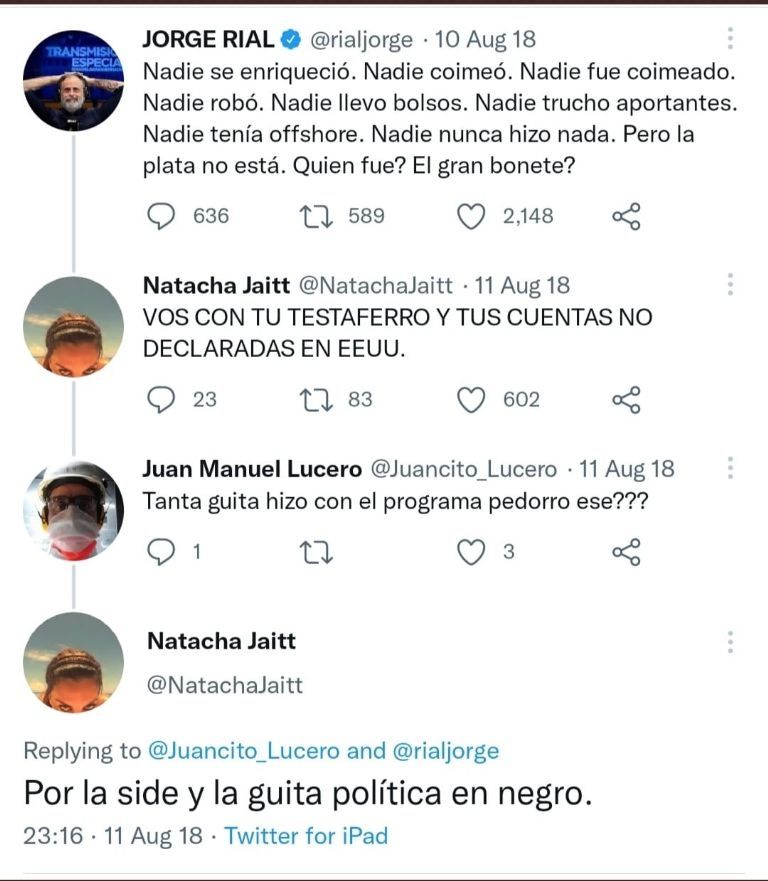 Ulises Jaitt, el hermano de Natacha, sacó a la luz viejos tuits de la mediática en los que acusaba a Rial de tener cuentas offshore. En agosto de 2018, el conductor habíaa expresado: “Nadie se enriqueció. Nadie coimeó. Nadie fue coimeado. Nadie robó. Nadie tenía offshore. Nadie nunca nada. Pero la plata no está. ¿Quién la tiene?”. A lo que Natacha Jaitt respondió en esa oportunidad de manera lapidaria: “Vos con tu testaferro y tus cuentas no declaradas en Estados Unidos”. A su vez, en ese hilo un internauta le preguntó al exlíder de Intrusos se había ganado ese dinero gracias a su programa en la televisión, mientras Natacha respondió: “Por la Side (Secretaría de Inteligencia del Estado) y la guita política en negro”.