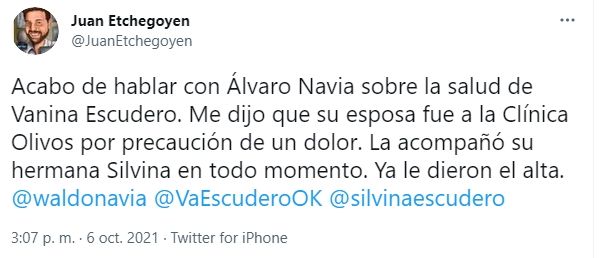 En la tarde del miércoles, el periodista Juan Etchegoyen confirmó desde su cuenta de Twitter: "Acabo de hablar con Álvaro Navia sobre la salud de Vanina Escudero. Me dijo que su esposa fue a la Clínica Olivos por precaución de un dolor. La acompañó su hermana Silvina en todo momento. Ya le dieron el alta".