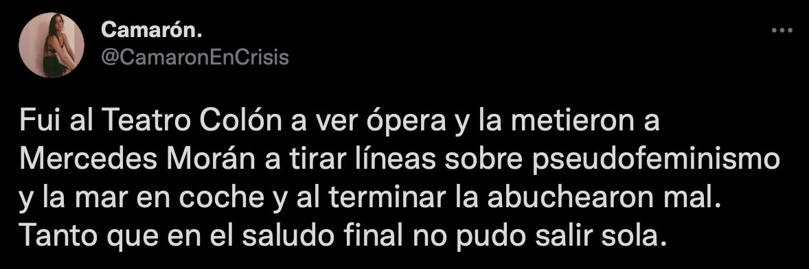 “Fui al Teatro Colón a ver ópera y la metieron a Mercedes Morán a tirar líneas sobre pseudofeminismo y la mar en coche y al terminar la abuchearon mal. Tanto que en el saludo final no pudo salir sola”, escribió una mujer del público. Asimismo, otro usuario twitteó: “Ni siquiera tuvo la valentía de saludar sola... Tuvo que salir con Theodora. Obviamente el abucheo no fue tanto... Pasó un poco desapercibido”.