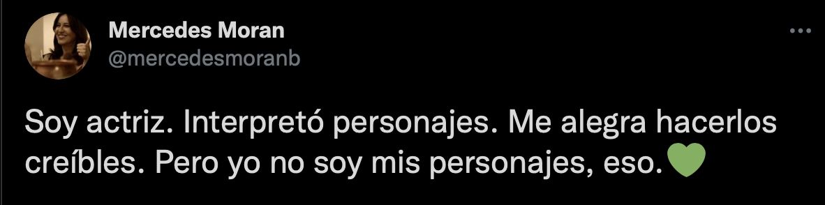 “Soy actriz. Interpreto personajes. Me alegra hacerlos creíbles. Pero yo no soy mis personajes, eso”, publicó Morán junto a un corazón verde que generó tanto aplausos y palabras de apoyo, como un nuevo repudio, en donde la acusaron de “mostrar la militancia” y de utilizar sus personajes “para exponer su postura política” sobre el escenario.