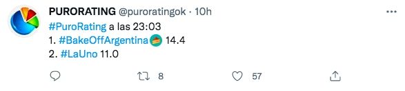 Más tarde, el prime time quedó para Bake Off(Telefe). El reality pastelero de Telefe tuvo una audiencia máxima de 14.4 puntos, logrando el segundo lugar de los ciclos más vistos del día.