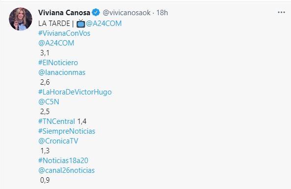 Tras su esperado regreso, Canosa compartió la excelente performance de audiencia que logró, con un pico de rating que alcanzó los 3.1. "Viviana con Vos: 3.1. El Noticiero de LN+: 2.6. La Hora de Víctor Hugo: 2.5. TN Central: 1.4. Muchas gracias a ustedes y a mi maravilloso equipo. Gracias por los mensajes tan amorosos que no doy abasto para responder, pero los leí. Que Dios los bendiga. Viva la vida", escribió Viviana.