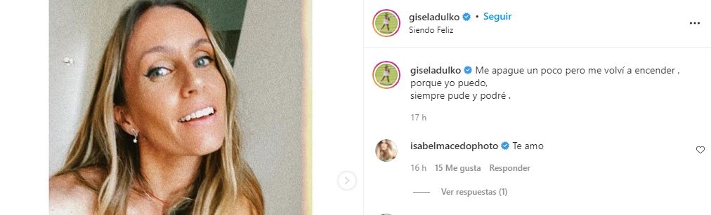 "Me apagué un poco, pero me volví a encender, porque yo puedo, siempre pude y podré", escribió Gisela Dulko en su último posteo de Instagram junto a una selfi, dejando en claro que no tiene problemas en volcar sus sentimientos en las redes sociales luego de la escandalosa separación de Fernando Gago. Una de las primeras en comentar su publicación fue Isabel Macedo. "Te amo", escribió la actriz y amiga de la ex tenista.