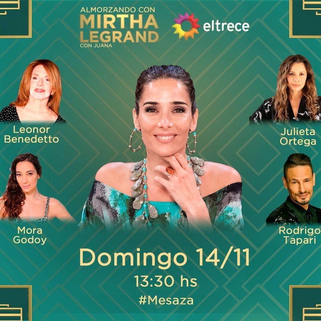 Finalmente, el domingo 14 de noviembre en Almorzando con Mirtha Legrand, Juanita contará con la visita de la bailarina Mora Godoy, quien deleitará a todos con sus pasos de tango; las actrices Leonor Benedetto y Julieta Ortega, quienes protagonizan "Perdida Mente", la nueva apuesta teatral de José María Muscari; y el cantante de cumbia Rodrigo Tapari, quien se encargará de cerrar el programa con la mejor música para bailar desde casa.