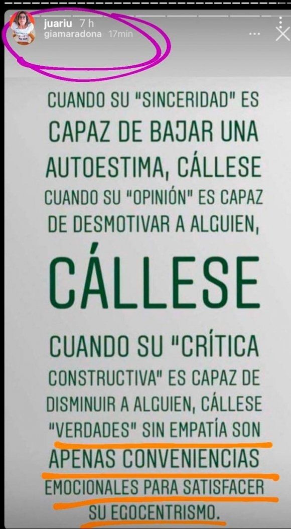 En este contexto, Gianinna compartió una llamativa y profunda reflexión: "Cuando su ‘sinceridad’ es capaz de bajar una autoestima, cállese. Cuando su ‘opinión’ es capaz de desmotivar a alguien, cállese", comentó la hija del Diez. Luego, continuó: "Cuando su ‘crítica constructiva’ es capaz de disminuir a alguien, cállese. ‘Verdades’ sin empatía son apenas conveniencias emocionales para satisfacer su egocentrismo".