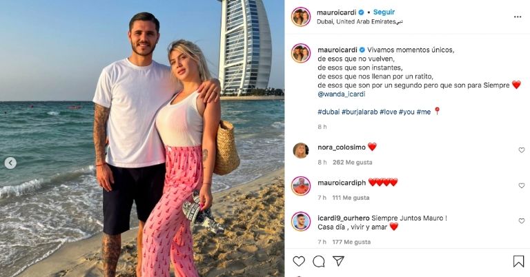 Cabe recordar que el pasado fin de semana Icardi también fue noticia por un particular mensaje que compartió en sus redes dedicado a su esposa. "Vivamos momentos únicos, de esos que no vuelven, de esos que son instantes, de esos que nos llenan por un ratito, de esos que son por un segundo pero que son para siempre", escribió el futbolista junto a una imagen en la playa a metros del lujoso hotel Burj Al Arab.