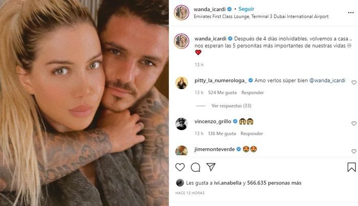Cabe recordar que en los últimos días, Wanda había publicado en su cuenta de Instagram una foto junto a Icardi, mostrándose super enamorada. "Después de 4 días inolvidables, volvemos a casa... Nos esperan las 5 personitas más importantes de nuestras vidas", había expresado la empresaria.