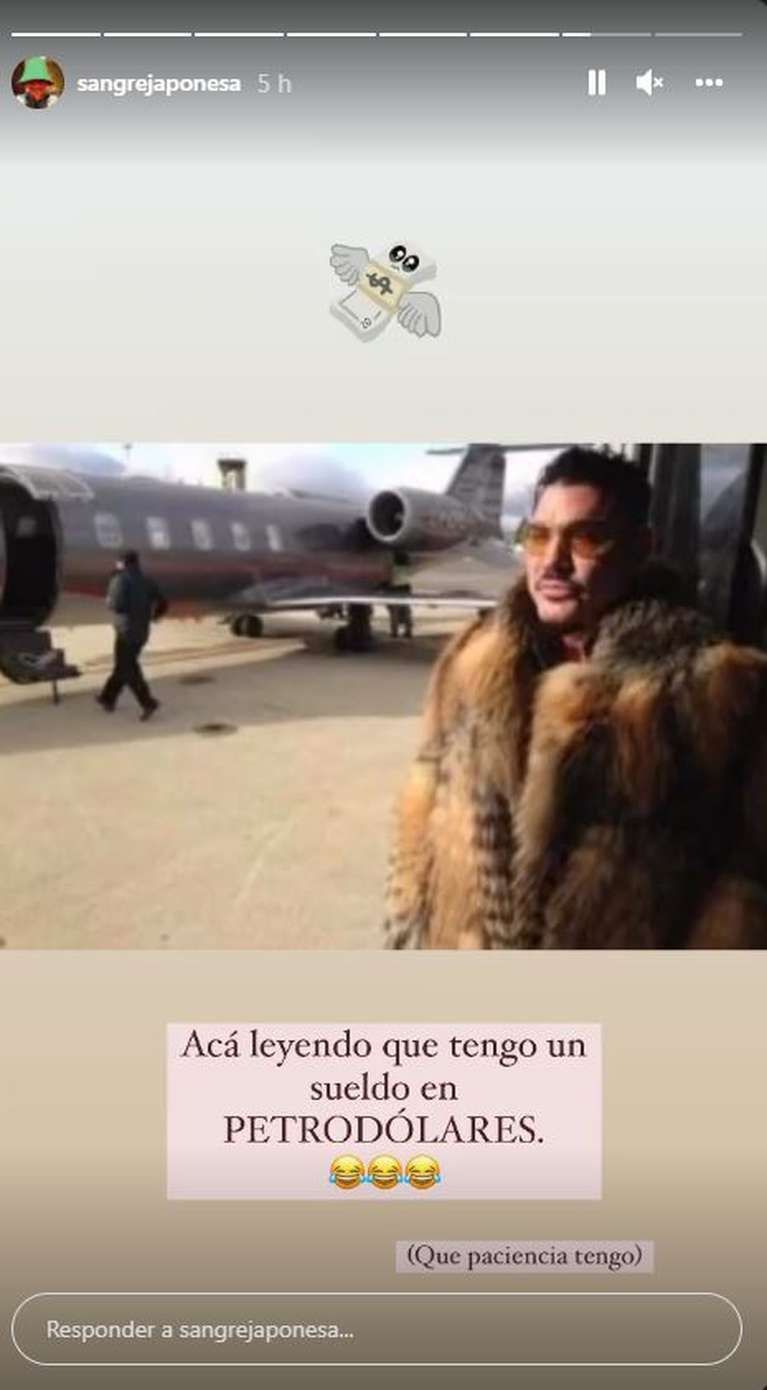 “Acá, leyendo que tengo un sueldo en petrodólares. Qué paciencia que tengo”, escribió la China Suárez a través de sus historias de Instagram la China Suárez junto a una imagen de Ricardo Fort luciendo un tapado de piel, con un avión privado de fondo y un gif de un fajo de dólares volando.
