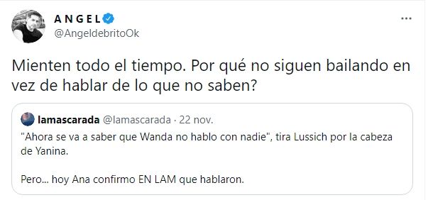 Luego fue otro usuario el que destacó: "'Ahora se va a saber que Wanda no hablo con nadie', tira Lussich por la cabeza de Yanina. Pero hoy Ana confirmó en LAM que hablaron", expresó. "Mienten todo el tiempo. ¿Por qué no siguen bailando en vez de hablar de lo que no saben?", disparó picante de Brito.