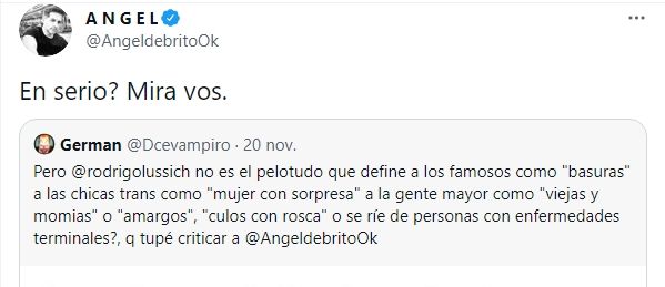 Un usuario compartió un fragmento de la entrevista y arrobó a De Brito para saber su opinión: "Pero, ¿@rodrigolussich no es el pel... que define a los famosos como ‘basuras’, a las chicas trans como ‘mujer con sorpresa’, a la gente mayor como ‘viejas y momias’ o ‘amargos’, ‘culos con rosca’ o se ríe de personas con enfermedades terminales? Qué tupé criticar a @AngeldebritoOk".