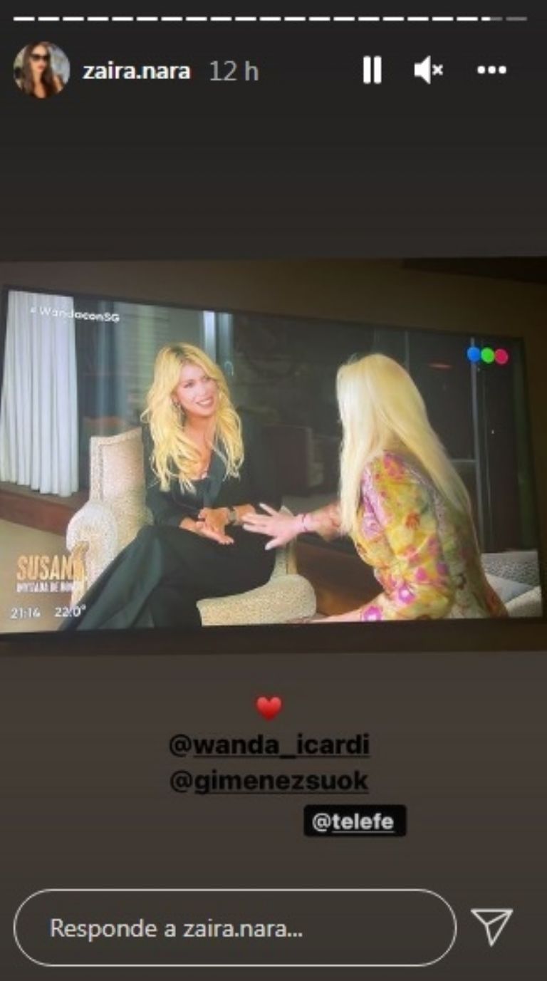 Zaira Nara no quiso quedar fuera de uno de los eventos televisivos del año y compartió para sus cuatro millones y medio de seguidores una foto de Wanda y Susana durante la entrevista mientras seguía las instancias a través de su televisor. La postal fue acompañada de un corazón dedicado a las dos mujeres.