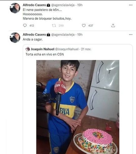 Luego de la polémica, Casero se volvió a referir al tema: "El nene pastelero de k5n... Hoooooo. Manera de bloquear boludos, hoy".