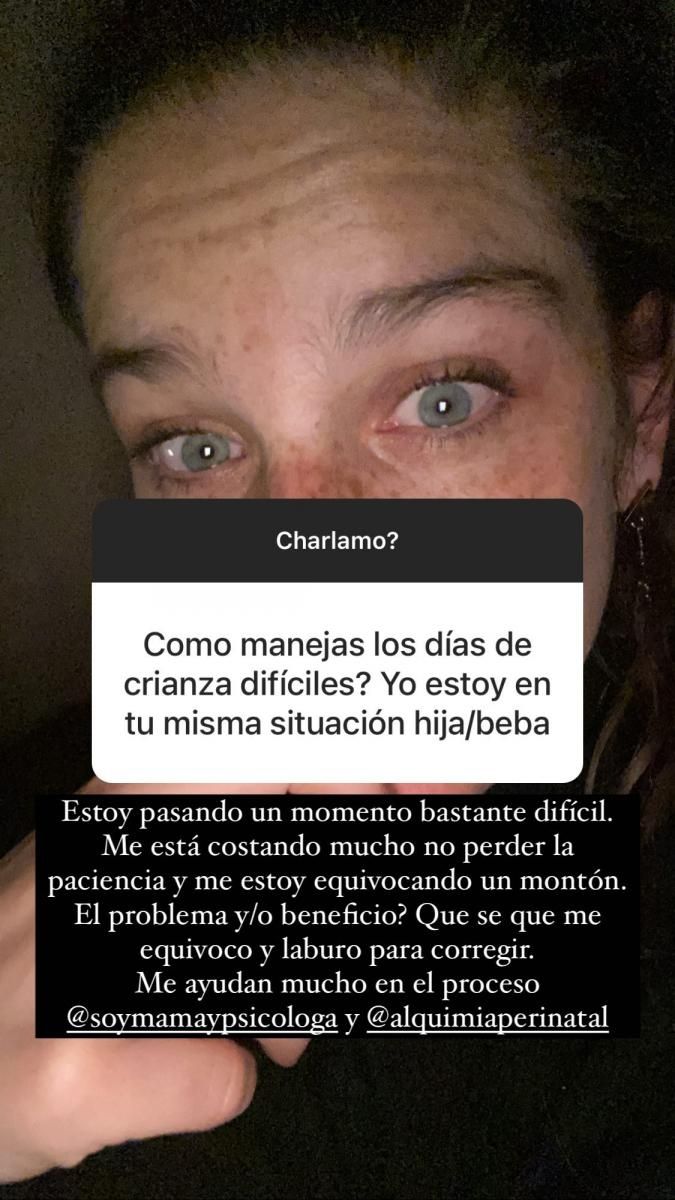 Además, reconoció que está trabajando en mejorar sus problemas de impaciencia. "¿El problema y/o beneficio? Que se que me equivoco y laburo mucho para corregir". También contó que recibe ayuda profesional para hacerle frente a esta dura etapa en su vida. "Me ayudan mucho en el proceso Soy mamá y psicóloga y Alquimia Perinatal", concluyó.