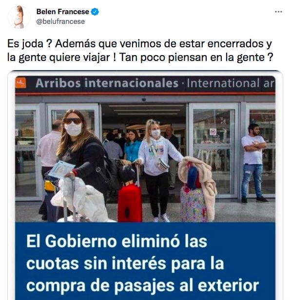 "¿Es joda? Venimos de estar encerrados y la gente quiere viajar ! ¿Tan poco piensan en la gente?", reaccionó la actriz desde su cuenta oficial de Twitter al compartir lo portada de un sitio con la noticia.