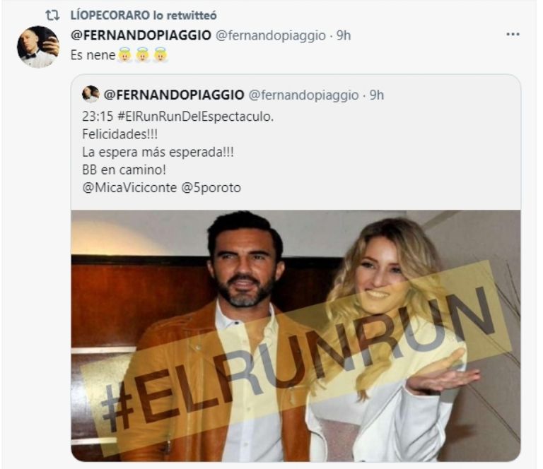 Mica Viciconte y Fabián Cubero están esperando su primer hijo juntos. Así lo confirmó Lío Pecoraro en su cuenta de Twitter. "¡¡Felicidades!! ¡La espera más esperada! ¡BB en camino! @MicaViciconte @5poroto", escribió el conductor de El runrún del espectáculo (Crónica TV).