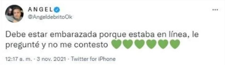 La noticia fue respaldada por Ángel de Brito. El conductor de Los ángeles de la mañana publicó este miércoles en sus redes sociales: "Debe estar embarazada porque estaba en línea, le pregunté y no me contestó".