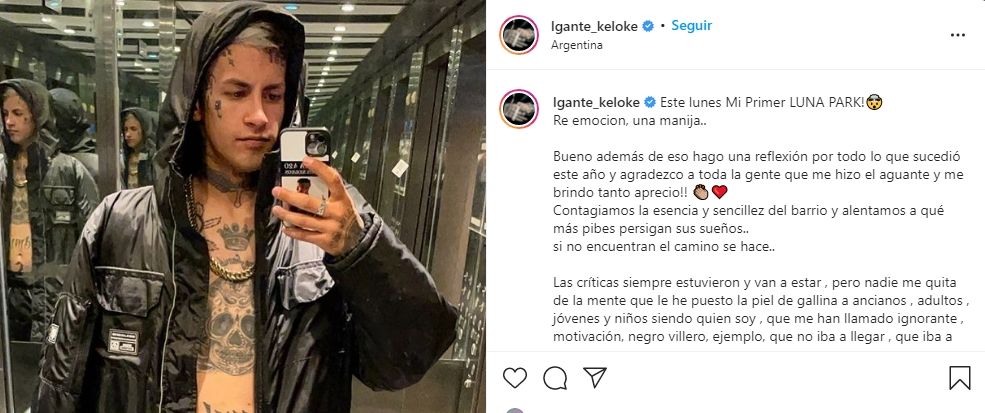 Recordemos que el cantante dará un show en el Luna Park. En su cuenta de Instagram manifestó lo que siente por este inolvidable 2021 colmado de éxitos: "¡Este lunes Mi Primer LUNA PARK! Re emoción, una manija... Bueno además de eso hago una reflexión por todo lo que sucedió este año y agradezco a toda la gente que me hizo el aguante y me brindó tanto aprecio. Contagiamos la esencia y sencillez del barrio y alentamos a qué más pibes persigan sus sueños... si no encuentran el camino se hace... Las críticas siempre estuvieron y van a estar, pero nadie me quita de la mente que le he puesto la piel de gallina a ancianos, adultos, jóvenes y niños siendo quien soy”.