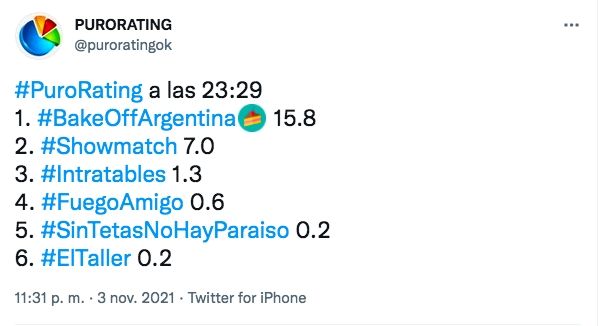 Por su parte, Bake Off (Telefe) alcanzó los 15.8 puntos, superando a La 1-5/18 y ShowMatch, sus competidores directos de El Trece. La ficción producida por Polka llegó a un promedio de 9.3 puntos. En cuanto al certamen conducido por Marcelo Tinelli, ayer alcanzó los 7 puntos, perdiendo por el doble contra el reality pastelero.