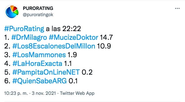 Más temprano, El Trece logró remontar notablemente los números de audiencia con Guido Kaczka, quien alcanzó un pico de 10.9 puntos con Los 8 escalones del millón, que se mantuvo segundo en la franja correspondiente a su horario.
