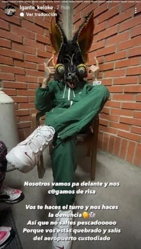 Sentado con un traje verde, unas zapatillas blancas y una máscara de conejo, L-Gante increpó a Zaramay con el mensaje: “Nosotros vamos pa’ delante y nos cag...os de risa. Vos te hacés el turro y nos hacés la denuncia. Así que no saltes, pescado. Porque vos estás quebrado y salís del aeropuerto custodiado”.