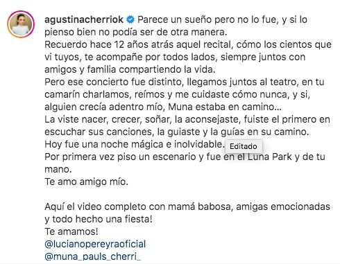 Por su parte, Agustina también le agradeció al músico, con el que comparte una gran amistad hace años. "Parece un sueño pero no lo fue y, si lo pienso bien, no podría ser de otra manera. Recuerdo hace 12 años aquel recital, te acompañé por todos lados, siempre juntos con amigos y familia compartiendo la vida. Pero ese concierto fue distinto. Llegamos al teatro, en tu camarín charlamos, reímos y me cuidaste como nunca. Y sí, alguien crecía adentro mío. Muna estaba en camino. La viste crecer, nacer, soñar, la aconsejaste, fuiste el primero en escuchar sus canciones. Hoy fue una noche mágica e inolvidable".