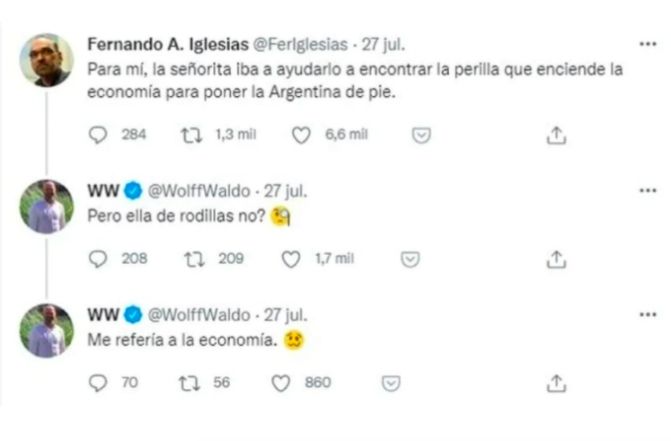 Recordemos que los diputados opositores habían publicado mensajes en Twitter considerados misóginos y sexistas, a propósito de una visita al presidente Alberto Fernández. En aquella ocasión, Iglesias publicó un tuit en el que expresaba: "Para mí, la señorita iba a ayudarlo a encontrar la perilla que enciende la economía para poner a la Argentina de pie". Wolff respondió: "Pero ella de rodillas no?".