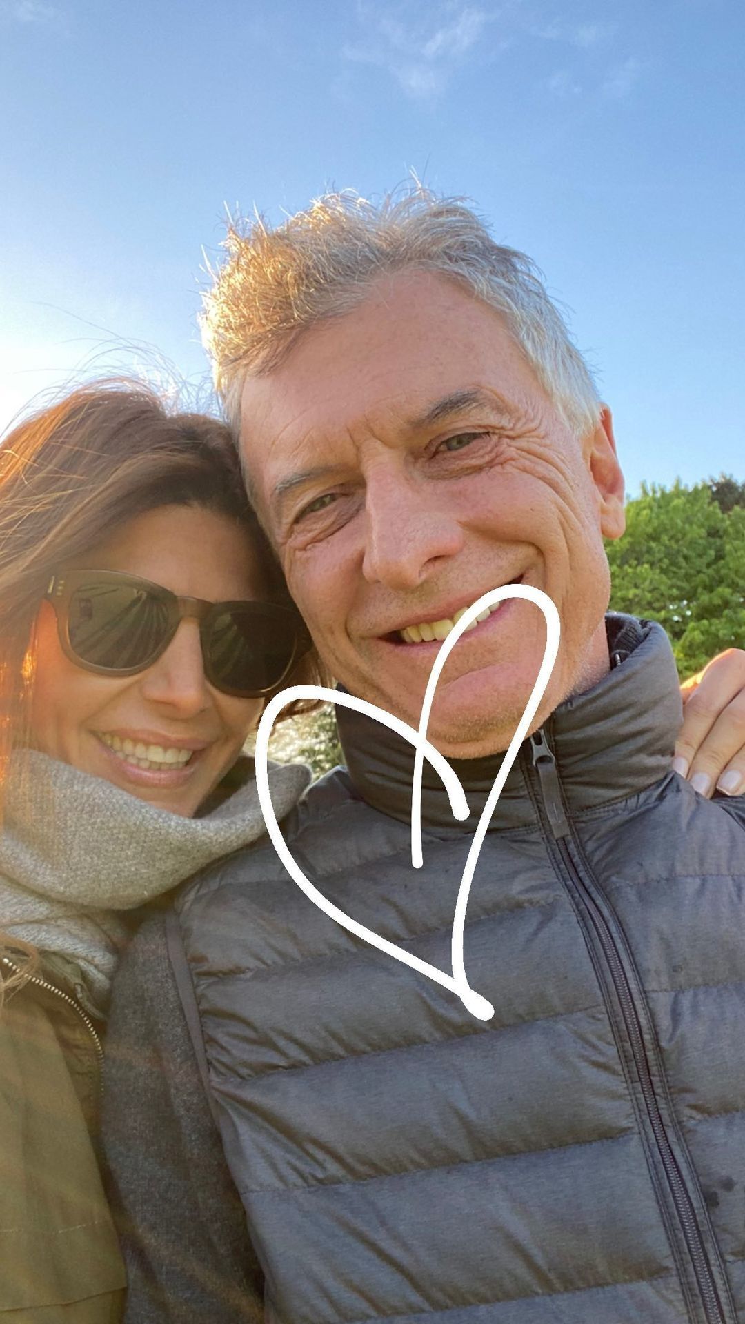 La pareja posó abrazada en modo selfie, luciendo una gran sonrisa, abrigados y con un cielo despejado a su espaldas. Sobre la foto, Juliana Awada dibujó un gran corazón dando por tierra así los rumores de ruptura que circulan el matrimonio.