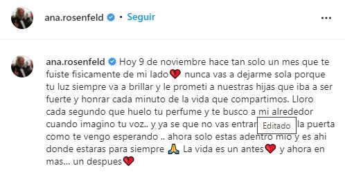 Ana Rosenfeld publicó un desolador mensaje a un mes de la muerte de su marido