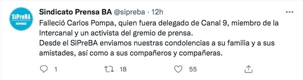 El sindicato de Prensa de Buenos Aires (Sipreba) expresó su dolor por la triste noticia. "Falleció Carlos Pompa, quien fuera delegado de Canal 9, miembro de la Intercanal y un activista del gremio de prensa. Desde el SiPreBA enviamos nuestras condolencias a su familia y a sus amistades, así como a sus compañeros y compañeras", publicaron.