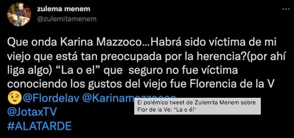 Enterada de la noticia, Zulemita Menem se mostró furiosa en las redes sociales. "Qué onda Karina Mazzoco... ¿Habrá sido víctima de mi viejo que está tan preocupada por la herencia? (Tal vez liga algo)", expresó. Luego, finalizó con un polémico comentario dedicado a Flor, el cual generó repudio en las redes. "La o él, que seguro no fue víctima conociendo los gustos del viejo, fue Florencia de la Ve", sentenció.