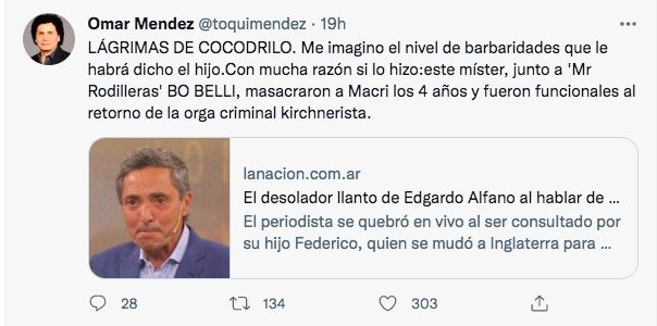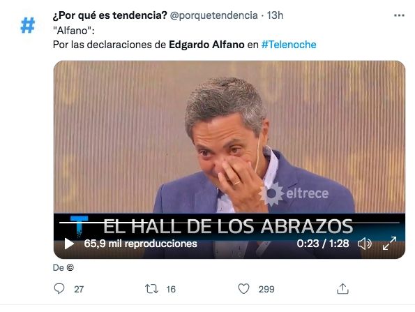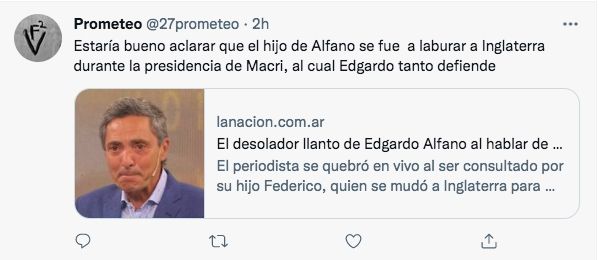 Finalizada la información, la cámara fue directo a Alfano que no pudo contener sus lágrimas al recordar el regreso de su hijo Federico quien vive en Norwich, Inglaterra, donde trabaja como investigador científico. "Fueron dos años duros en los que uno la pasó difícil. No puedo...", dijo el periodista antes de romper en llanto.